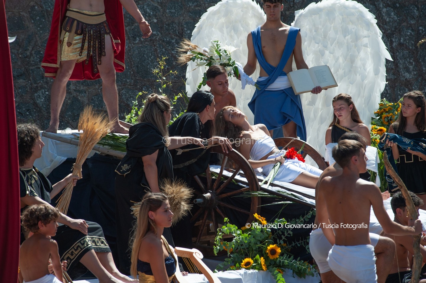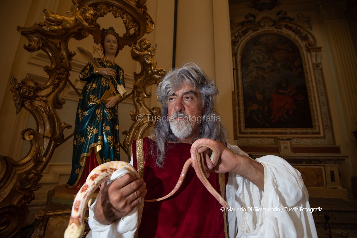 La profonda devozione cittadina si manifesta in dettagli toccanti, come la scelta del giovane Tiria, che ha interpretato la santa nella rappresentazione teatrale di Piazza Matteotti la mattina del 24 luglio. La leggenda narra che Tiria fosse il nome della santa prima del suo battesimo. Un’altra collaborazione degna di nota è quella con Mario “il Serparo”, che da otto anni porta i suoi serpenti vivi per arricchire il realismo della rappresentazione teatrale “I Serpenti” in Piazza San Giovanni.