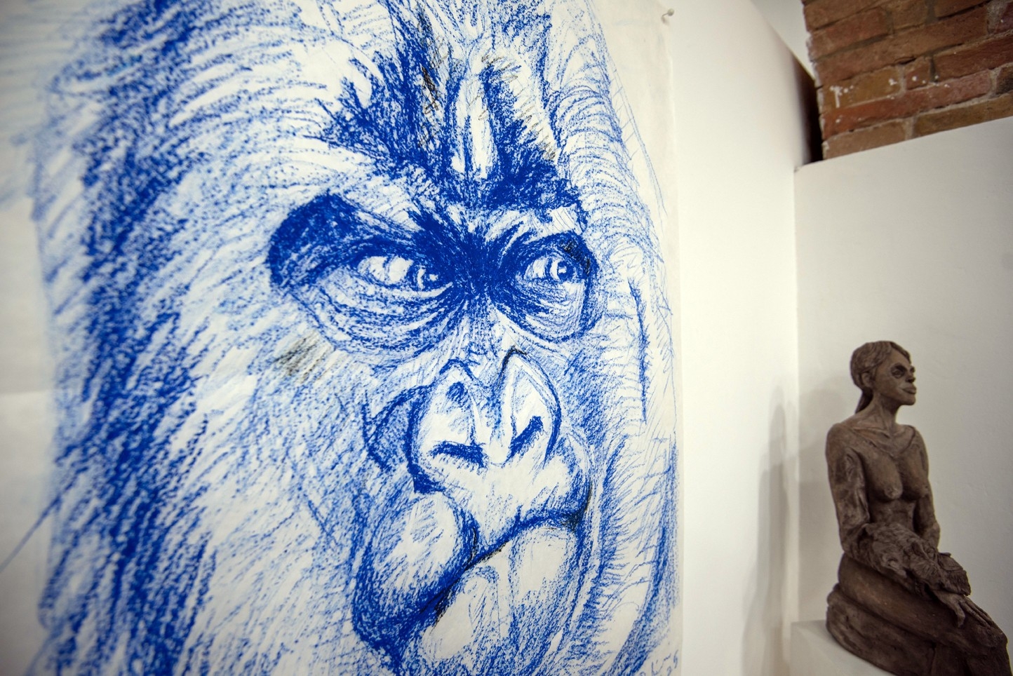Questo processo si è manifestato pienamente nell’attuale corpus di opere, incentrato interamente su esseri non umani e antropomorfi, principalmente primati. La serie nasce da una domanda apparentemente semplice posta da uno studente: “Professore, abbiamo creato un’altra scimmia?”.