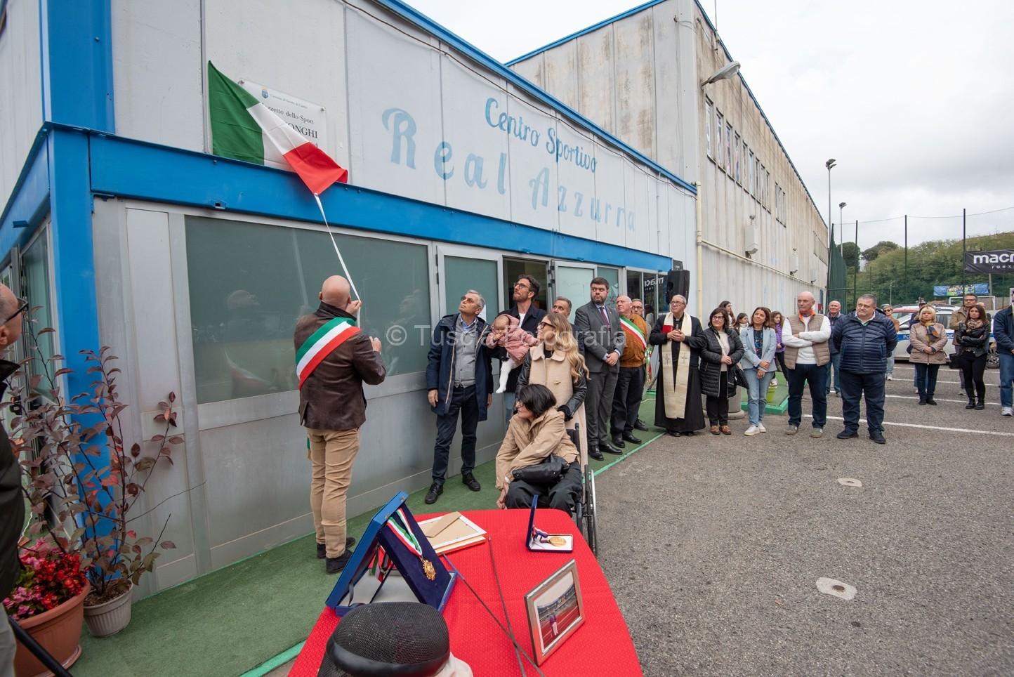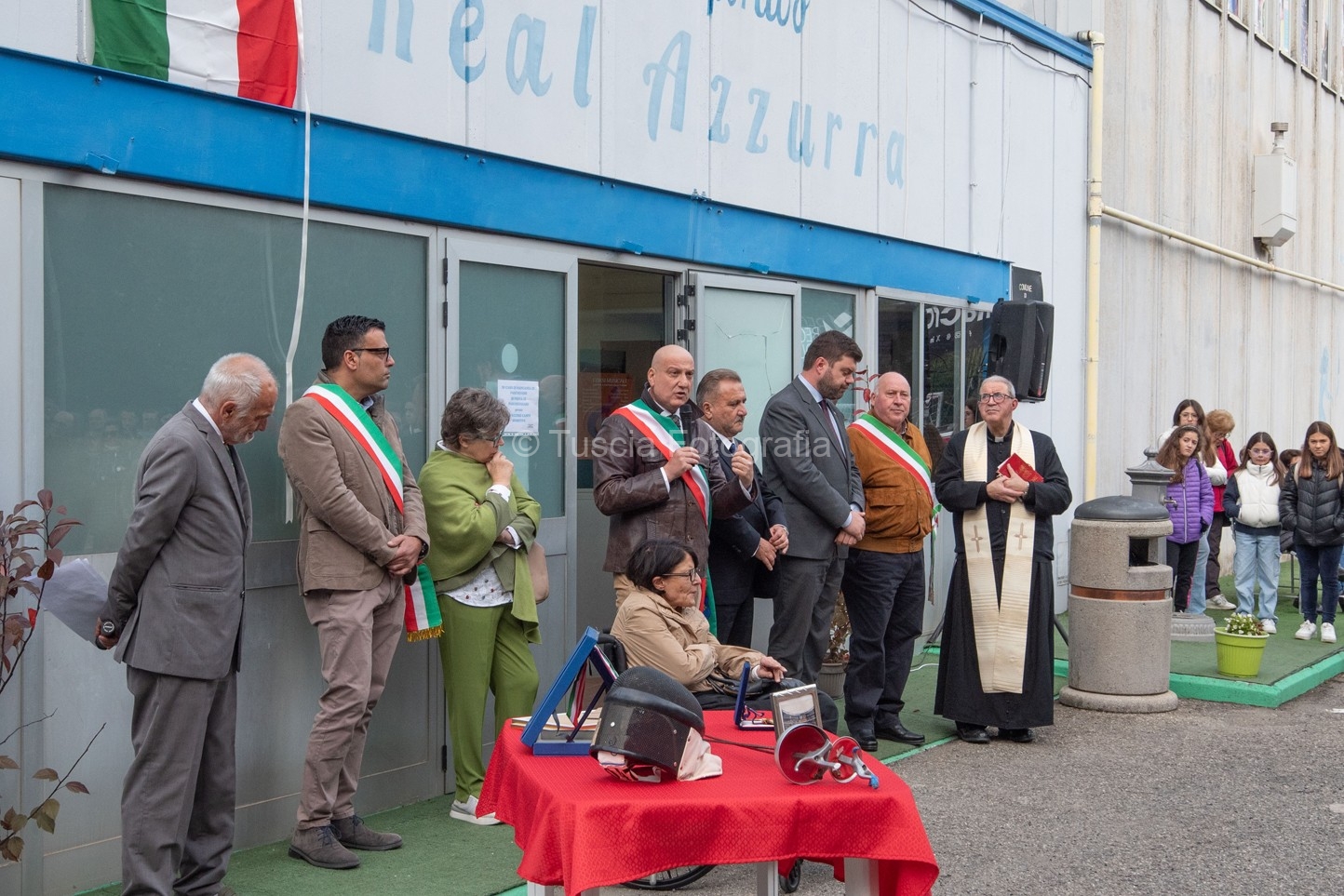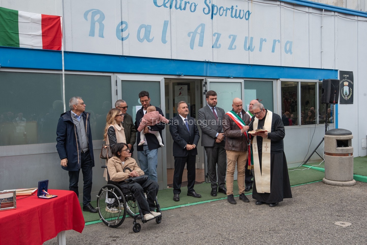 La benedizione del Parroco di Grotte di Castro Don Tancredi Muccioli a preceduto il momento dello scoprimento della targa commemorativa, posta sopra l’ingresso principale del palazzetto, al suono solenne dell’inno nazionale eseguito magistralmente dalla banda musicale “G. Verdi” di Grotte di Castro.
