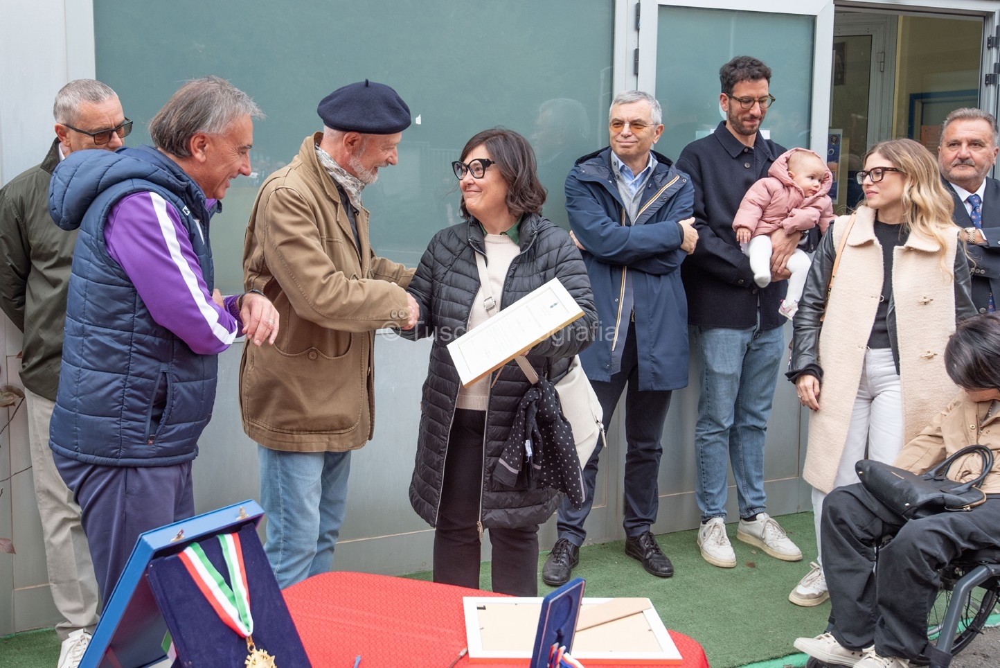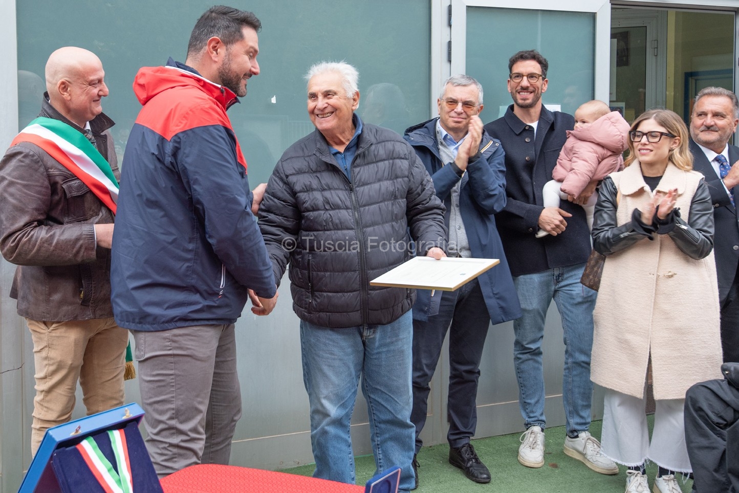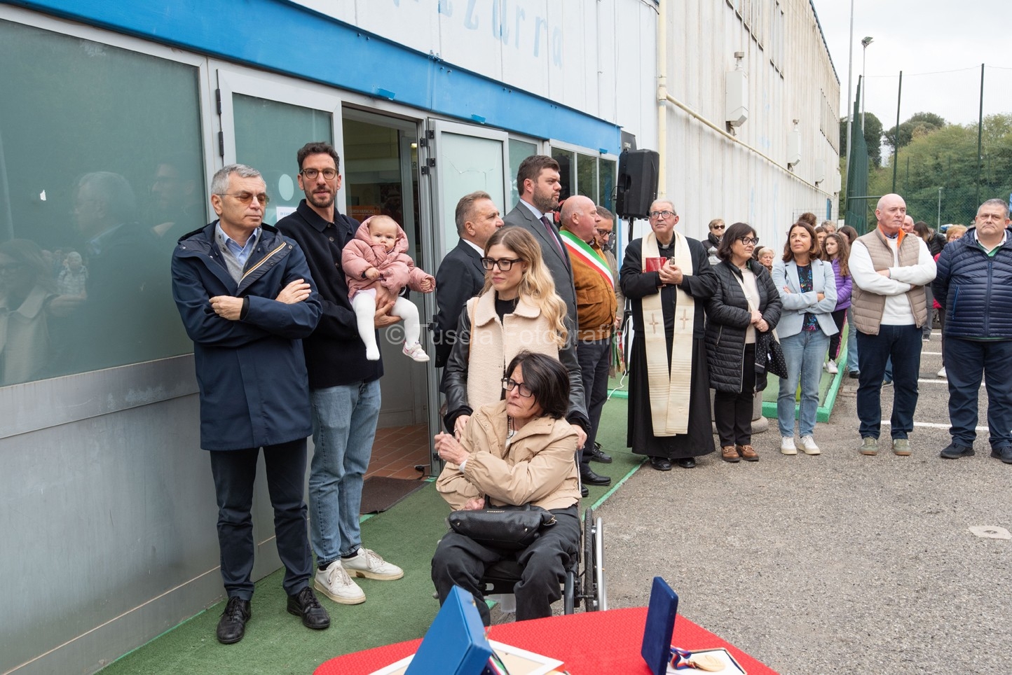 La benedizione del Parroco di Grotte di Castro Don Tancredi Muccioli a preceduto il momento dello scoprimento della targa commemorativa, posta sopra l’ingresso principale del palazzetto, al suono solenne dell’inno nazionale eseguito magistralmente dalla banda musicale “G. Verdi” di Grotte di Castro.